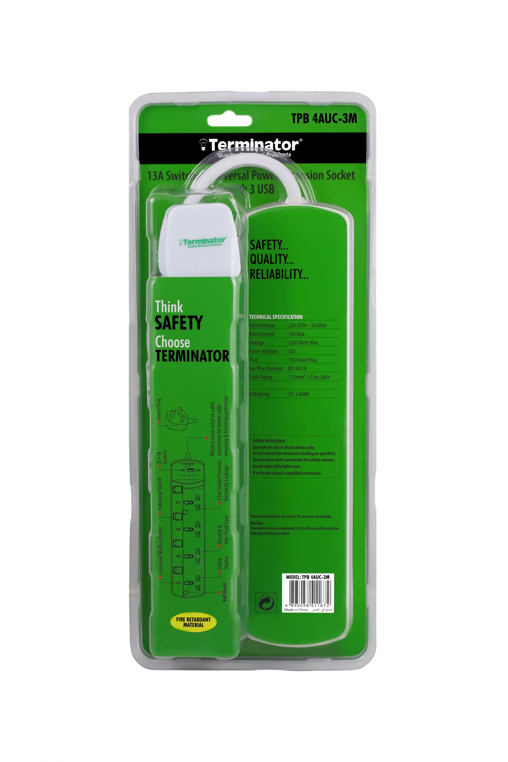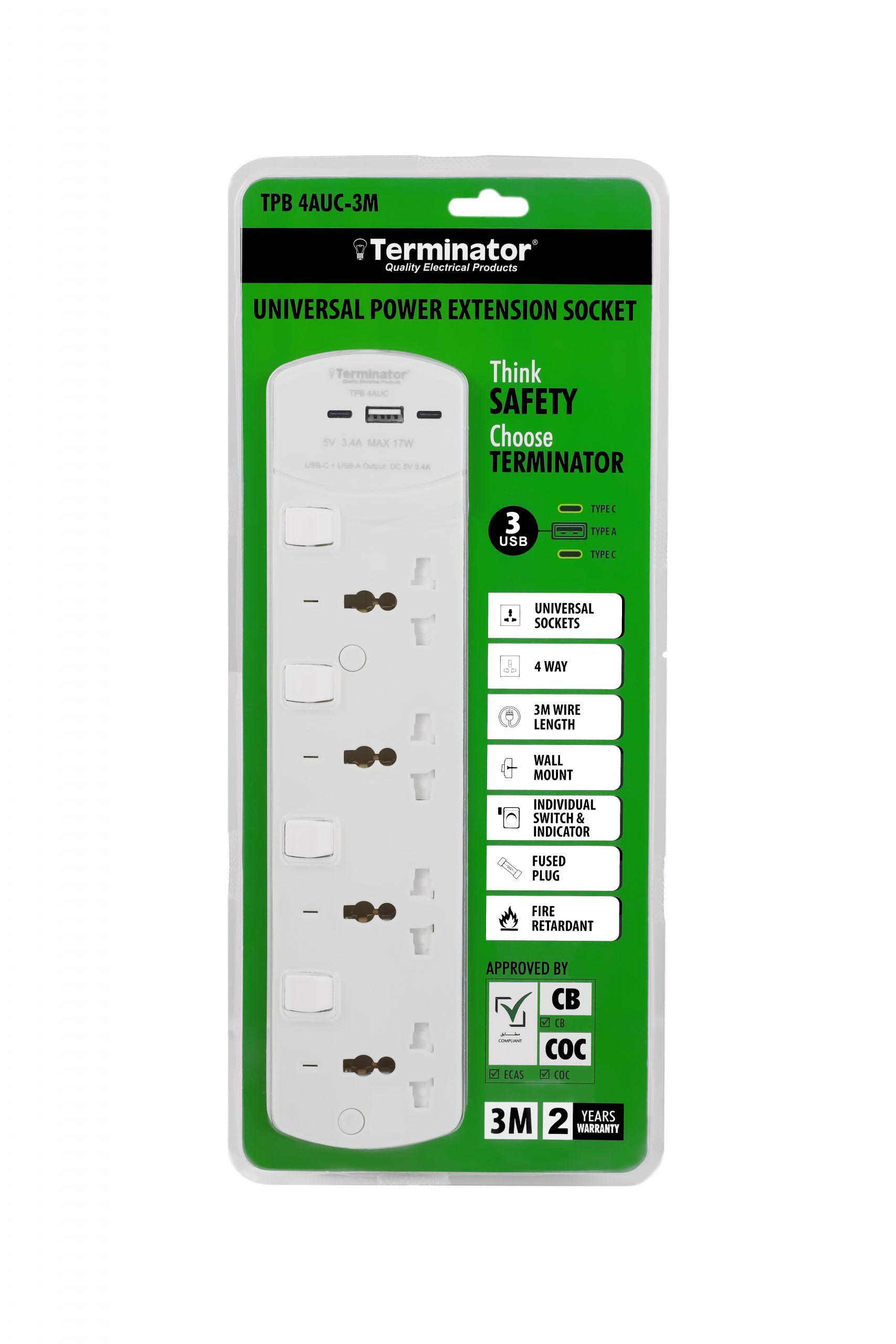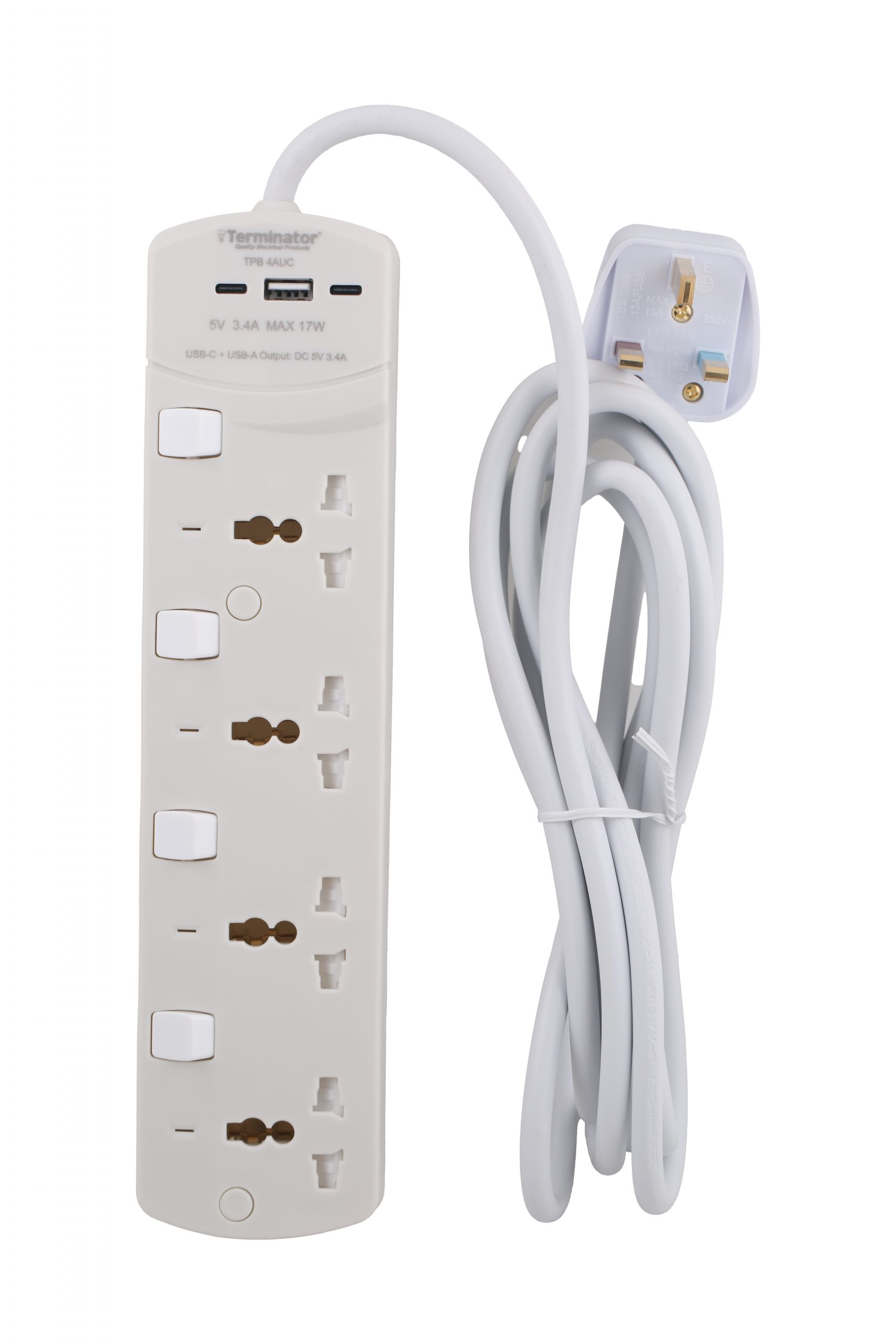 4 Way Universal Power Extension Socket With 3USB 3.4Amp (A & C Type), Individual Switches, Indicators, 1.25mm² Cable 3M & 13A Fused Plug